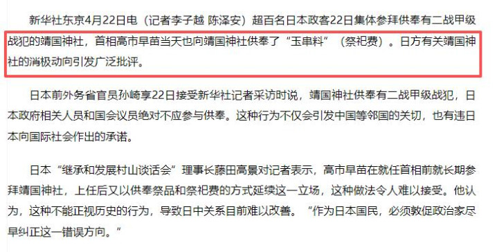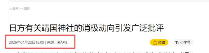 新华社2026-04-22《日方关联靖国神社的消极动向激发平淡月旦》